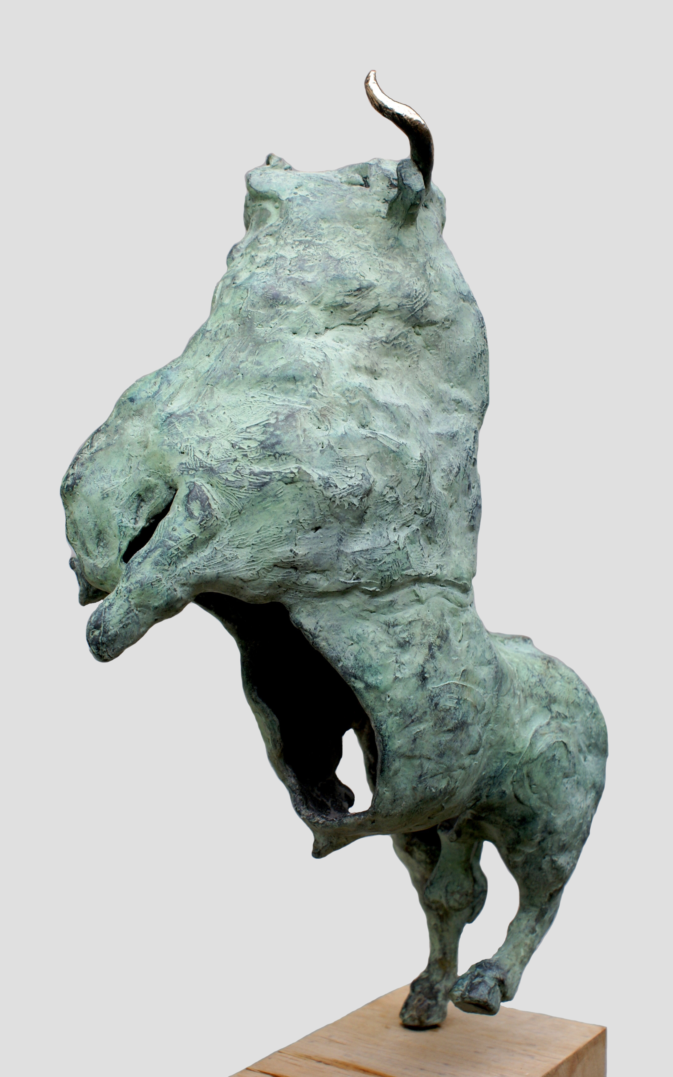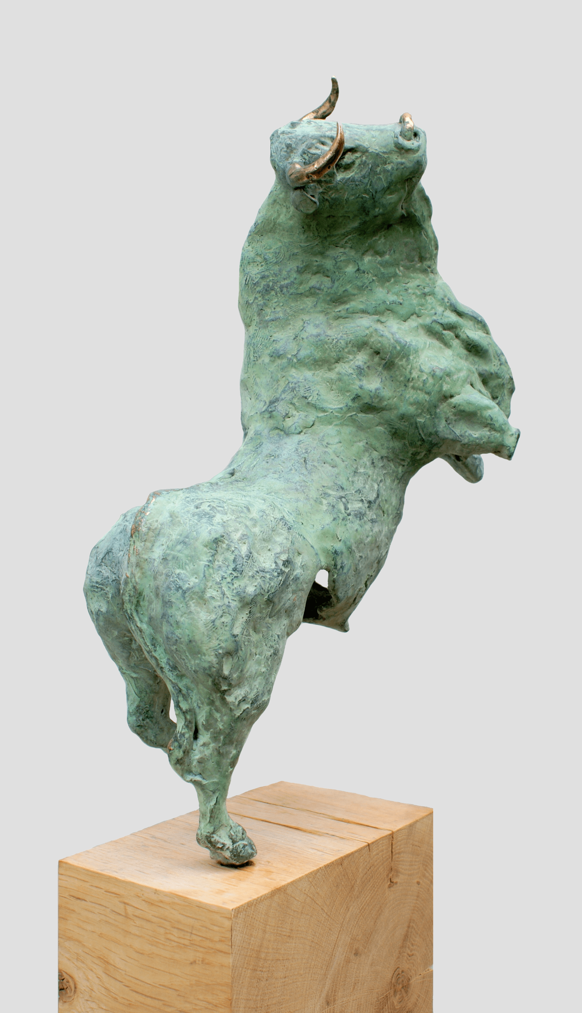 STIER 7Door Monique Spapens / 11 oktober 2013 12 juni 2021 Bronzen dansende stier 7 fragment met gepolijste neusring en hoorns op eikenhouten sokkel. unicum