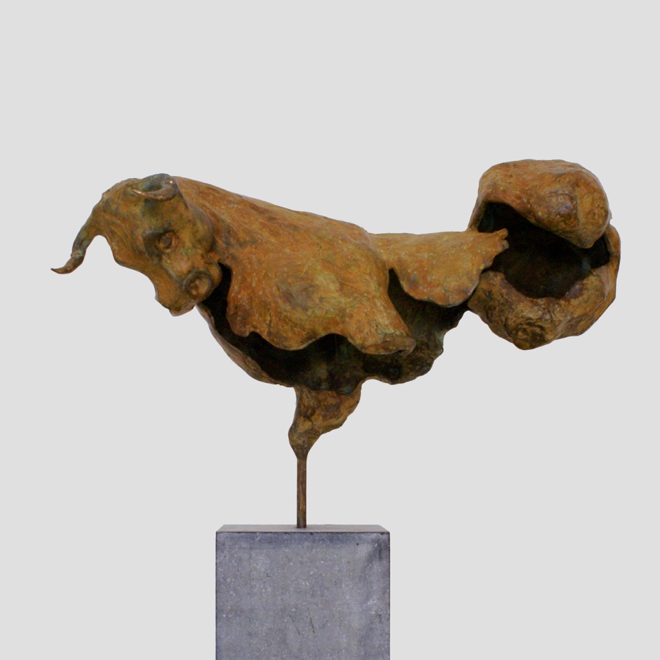 Bronzen stier fragment Forza maakt een draai met zijn achterwerk en is opengewerkt. Hij staat op een hardstenen sokkel van 90 cm hoog en komt het best tot zijn recht in de ruimte, bijvoorbeeld als tuinbeeld.