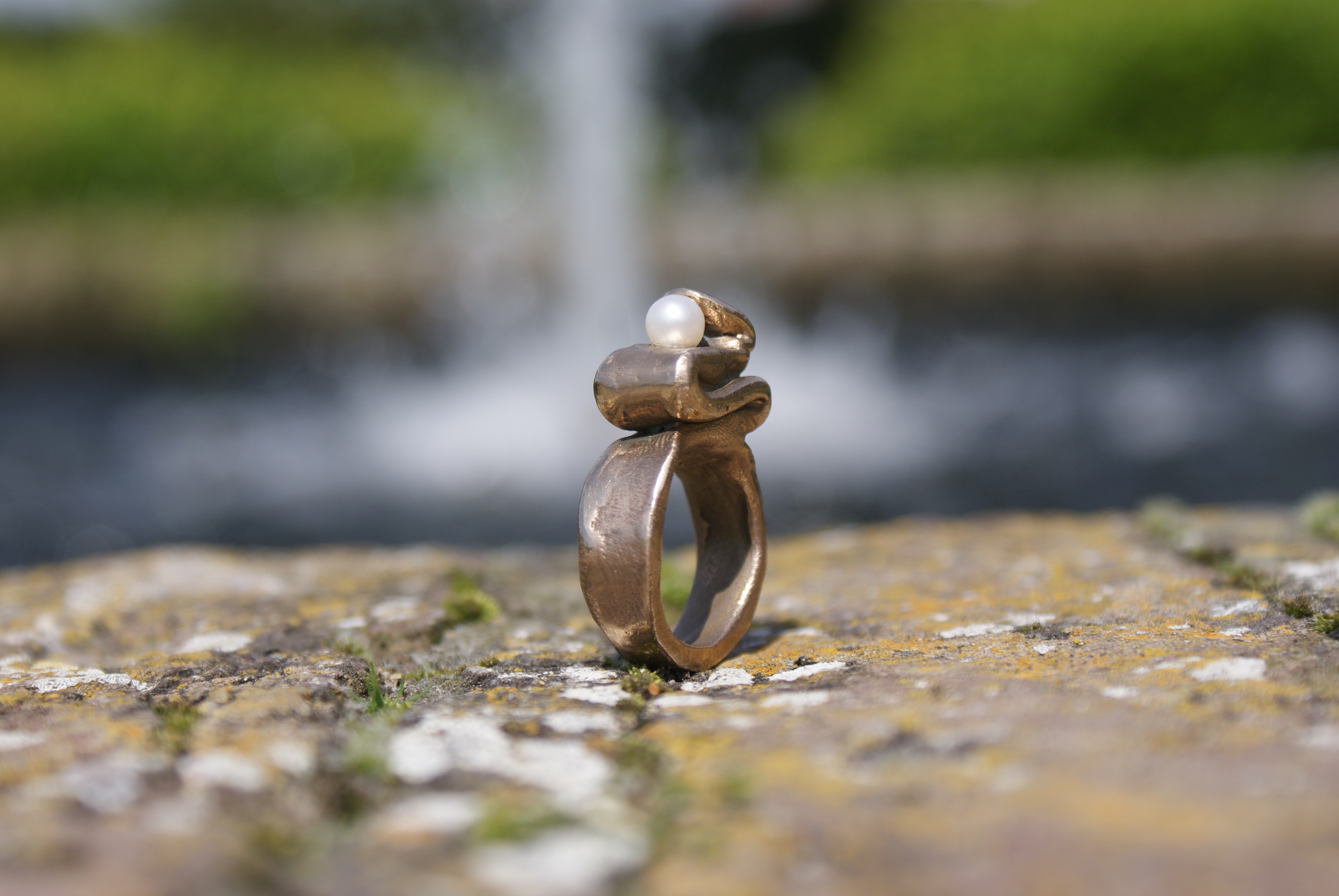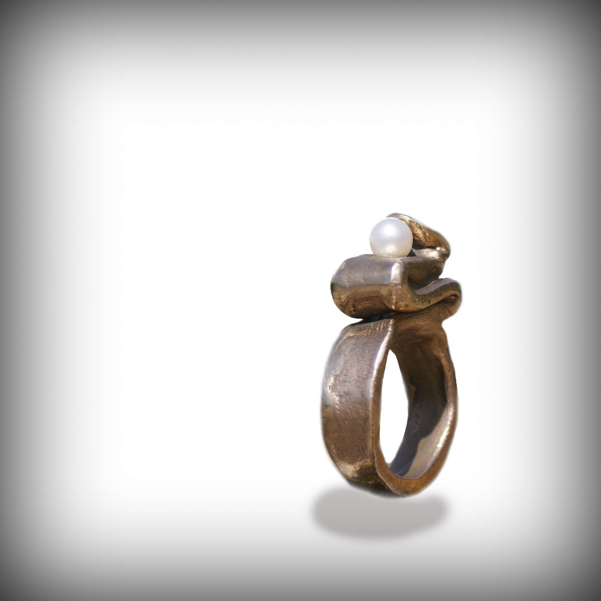 bronzen ring ‘Matto’ is een echte one-of-a-kind ring met een mooie witte zoetwaterparel op de top.