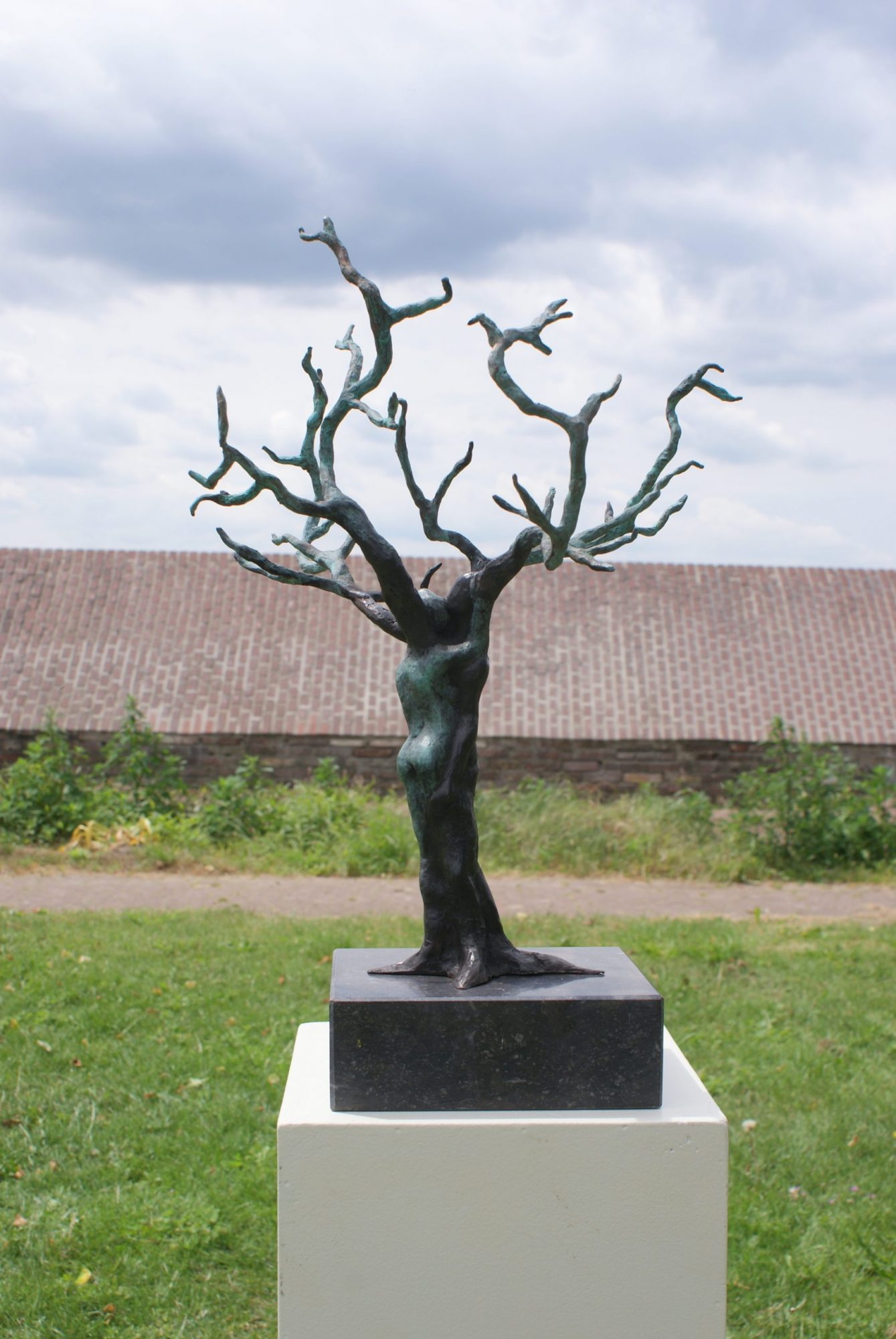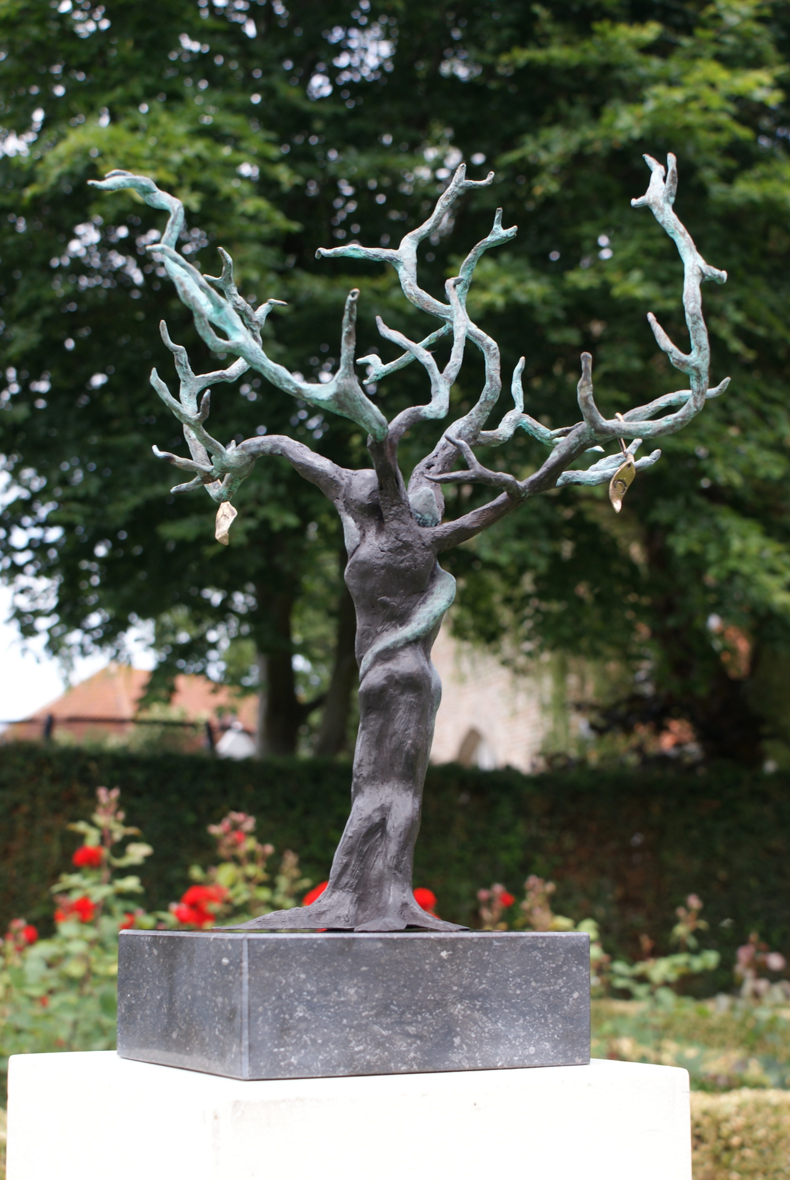 Opdracht voor 25-jarig huwelijk, levensboom ‘Roots’, twee lichamen in stam verstrengeld, uitlopend in vier vertakkingen. Twee goudkleurige blaadjes met inscriptie van dochters hangen aan de boom. Liefde, leven, geborgenheid en intimiteit. Huwelijkscadeau.